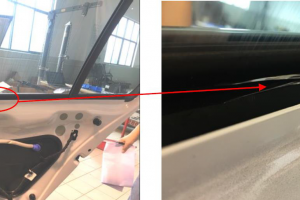 将玻璃上升至顶,发现玻璃贴膜底部已损坏。这极有可能是发出异响的部位。(图2)。