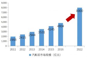 根据罗兰贝格研究,2011-2016 年中国汽车配件后市场规模以年均20%的增速扩张,规模由2011 年的1900 亿元增长到2016 年的4804亿元,未来可以预期的是,受保有量、车龄等因素和市场驱动力影响,2022 年汽车配件后市场规模有望超过8000 亿元。