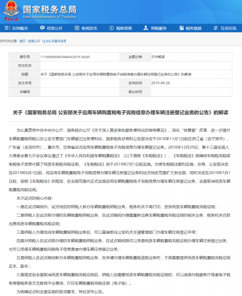 近日,国家税务总局、公安部联合印发《关于应用车辆购置税电子完税信息办理车辆注册登记业务的公告》。自2019年6月1日起,机动车纳税完税证明,全国范围内将实现数字化。