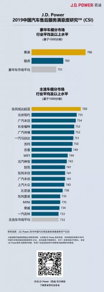 J.D. Power 2019中国汽车售后服务满意度研究(CSI)已经进入第19个年头。这项研究评测的是拥车期为13至48个月的车主对经销商服务部门维修或保养服务的满意度。这个拥车时间段通常是车辆保修期的重要组成部分。这项研究通过五个衡量因子确定总体售后服务满意度,五个因子包括 “服务启动” (22%)、 “服务顾问”(19%)、”服务质量”(21%)、”经销商设施”(20%)和”服务后交车”(19%)。汽车售后服务满意度得分采用1,000分制。