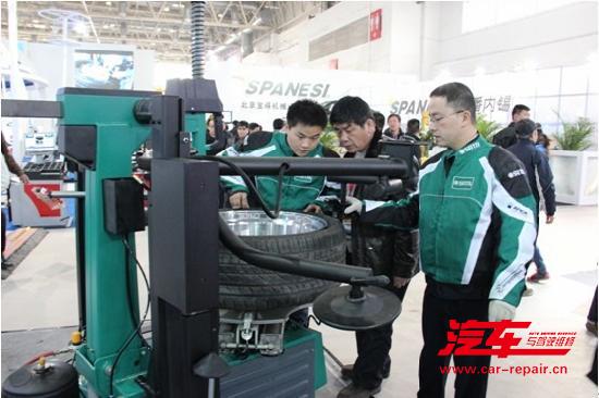 工作人员现场演示轮胎拆装设备