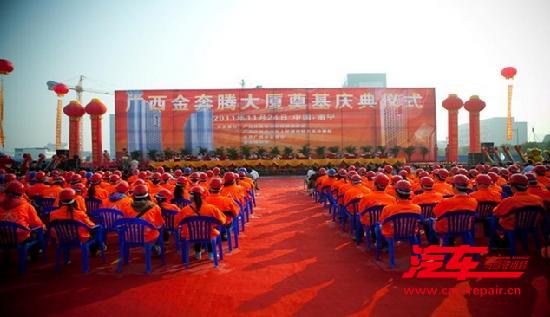伴着气势恢宏的军乐声和喜庆激昂的锣鼓声,在漫天绽放的礼花中,在主席台前排就座的各位领导为广西金奔腾大厦奠基剪彩。