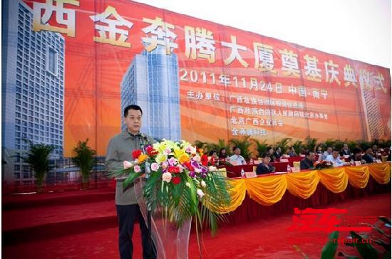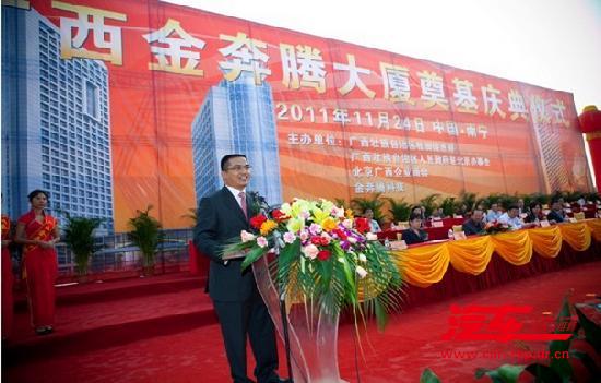 “我宣布广西金奔腾大厦奠基仪式开始”,随着广西壮族自治区人民政府副秘书长张振东宏亮地宣布奠基正式开始之后,在主席台前排就坐的领导共同为项目奠基培土。