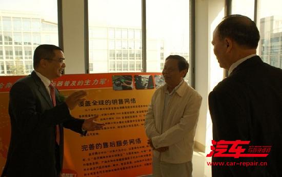在舞狮,礼花,锣鼓,礼炮、军乐烘托的热闹气氛中,各位领导和嘉宾离开奠基现场来到广西金奔腾汽车科技有限公司办公楼参观。在三楼图片展示区中,宋有董事长详细的向各位领导、嘉宾介绍了金奔腾12年来的发展情况。
