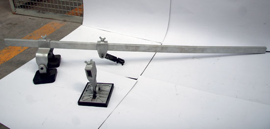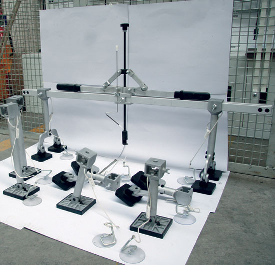 强力拉拔工具组包括横梁组件、单支脚架和双支脚架各1套(图2),主要适用于创伤小、应力大的部位,如前骨架、车顶外纵梁、外后挡泥板、门槛、行李舱盖、后翼子板、前门以及中间立柱等。顾名思义,强力拉拔工具组是针对较硬钢板而设计,其拉拔主体采用坚硬的合金材料制成,可修复大部分的损伤,有效地减小板件更换率。