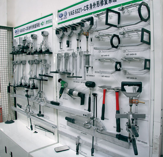 出于工具摆放清晰合理、易管理、充份利用立体空间以及保护易损工具的目的,NST8770车身外形钣金修复系统专门配备了专用工具挂板(图11)。另外,为了方便智能焊接主机的移动,使钣金维修工作更加便捷,还配备了智能焊接主机存放车。