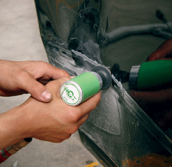 使用之前所选定的拉拔工具对变形部位进行拉拔修整,然后拆下介子片,使用角向研磨机打磨焊点,完成整个钣金修复流程。