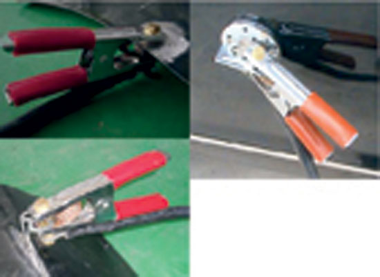 ② 连接智能焊接主机,并正确连接接地线。接地线的连接方法有3种(图13):一种是在所维修的金属板上找出一个边缘进行抛光,然后直接将搭铁钳牢固地夹在抛光的边缘上;对于没有边缘可用的情况,应在将金属表面抛光后,把磁性吸盘吸在抛光的部位,然后把搭铁钳夹在吸盘的把手上;对于既无边缘,又不方便使用吸盘(如折角部位)的金属表面,可以采用介子片连接方式,即将介子片折弯成L型,焊接在抛光后的金属表面,然后将搭铁钳夹在介子片上即可。