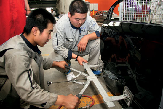 根据之前所做的变形性质分析,选择最适合的拉拔工具,如门槛、车顶外纵梁和前门以及中间立柱等部位钢板强度较高,则适合使用强力拉拔工具组进行修复;车身变形较小的部位,如圆型凹陷、线性侧身划伤等,则适合使用快速拉拔工具组;而对于面积较大的车顶,则适合使用省力型拉拔工具组进行修复。