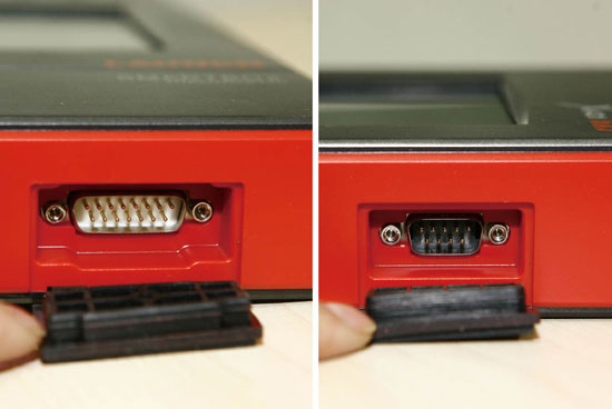 在整机下方和右侧边缘立面上,分别布置了用于连接诊断测试主线的接口和pc-center的接口(图6),这2个接口都用橡胶的封堵封住,防止在不用的时候灰尘进入。其中,pc-center的接口在以往的X431上,是使用专用的数据线将设备与PC机相连,用于存储诊断数据,尤其是一些动态的诊断数据。而在X431 GX3上,则是使用了蓝牙技术,将1个发射装置接在设备的pc-center接口上,而1个接收装置连接在PC机的USB接口上,从而实现诊断数据的无线传输。不过,pc-center为选配件,由用户自行选择购买。
