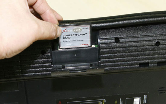 CF卡是用来存储诊断程序和诊断数据的,设备的升级也是依靠它来完成。升级时,将CF卡正确插入到CF卡读写器中,将CF卡读写器插入PC机的USB接口中(图10),登录X431的网站,选择需要升级的程序。使用过程中,要对CF卡妥善保护,如无必要,不要频繁将CF卡从设备内取出(图11),更不要在开机状态将CF卡取出,以免数据丢失。在升级过程中,也不要将CF卡读写器拔下,否则会导致CF卡内的数据丢失。