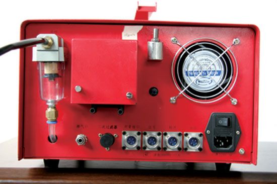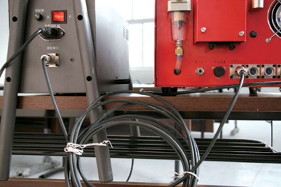 圣威汽柴两用尾气分析仪的辅机是一台用于柴油车尾气分析的不透光烟度计(图6)。柴油车尾气取样探头与辅机后方的取样气口通过输气管相连(图7),辅机侧面除了电源开关和电源插口外,还有一个信号端子,辅机检测到的柴油车尾气分析数据通过信号传输线输入到主机的测量接口(图8)。