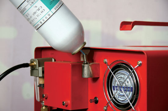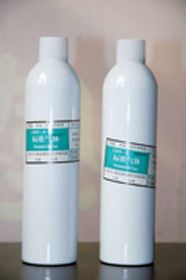 圣威汽柴两用尾气分析仪后部则由气体取样口、标准气口、排气口、信号端子插孔、电源以及二次过滤器等部分组成(图4)。气体取样口用于连接汽油车尾气取样探头的输气管,其下部有一个油水分离器。取样气体通过该口后首先经过油水分离器,将取样气体中的水分分离出来后,再进入主机中,与标准气体进行比较,最后得出尾气分析的数据。排气口用于取样气体的排出。信号端子插孔共有4个,最左边的为测量接口,用于柴油车尾气检测时与辅机的信号传输。标有“信号”的端子插孔用于检测线中与主机系统的信号传输。圣威汽柴两用尾气分析仪可以选配转速检测传感器和油温检测传感器,所测得的发动机即时转速和油温可以通过转速端子和油温端子传输给主机。标准气口用于主机的标定,当仪器经过长时间的使用后,需要向仪器内充入标准气体(图5),以保证检测的准确性。主机的供电为220 V,启动由电源开关控制。