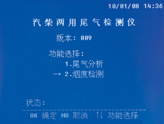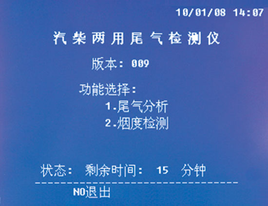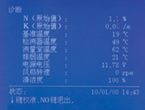 进行汽油车尾气检测时,主机开机启动后,进入汽柴两用尾气分析仪主界面,选择系统提示预热时间为15 min(图12),并开始倒计时,当计时为0时,预热结束。可以进行汽油车尾气检测。当进行柴油车尾气检测时,在汽柴两用尾气分析仪主界面选择“烟度检测”(图13),进入烟度检测界面后,观察“排烟温度”数值(图14),当排烟温度达到80℃时,辅机风扇开始转动,预热结束。有了明确的预热提示,维修人员可以很清楚地知道,什么时候可以开始检测尾气了。