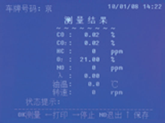 圣威汽柴两用尾气分析仪的主机外形与其他一些主流的汽油车尾气分析仪没有太多的区别,操作界面制成一个斜面,便于操作和读数(图2)。整个操作界面由3部分组成,分别为显示屏、操作键和打印机。设备启用后,显示屏为蓝色背景光,金色字体显示,非常清晰。操作键布置在显示屏下方,由“OK”、“ON”以及“上”、“下”、“左”和“右”6个键组成。操作人员按照显示屏上的提示,通过这6个键,完成各种检测步骤。主机除了能够进行检测数据的保存之外,还能够直接打印检测数据(图3),作为检测和维修的凭证提供给用户。