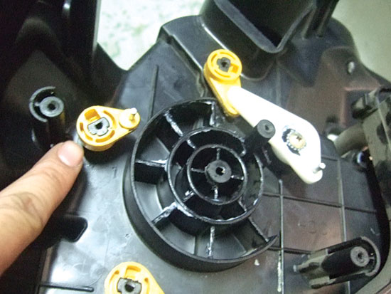 拆下空调风道,检查蒸发箱内部的风道转换系统,发现各翻板活动自如,无异常卡滞,似乎没问题。考虑到送风模式电机是新品,相对而言还是风道转换系统故障的可能性较大。再次仔细检查风道转换系统,反复活动所有翻板,观察各活动部位的工作情况,终于发现通风模式翻板轴存在晃动(图3),这很可能是故障原因。按照机械系统的要求,轴与轴承的配合间隙超差时,必须配套更换。