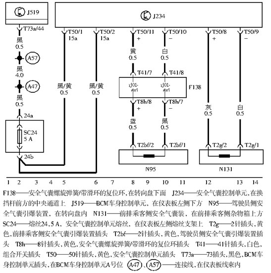 数据块中驾驶员侧安全气囊引爆装置N95的电阻值偏低,表明连接N95的相关线路及插头可能有故障,同时不排除安全气囊控制单元存在故障的可能性。既然J234能检测到N95电阻值过低,而且能激活仪表板上的安全气囊报警灯K75并能准确无误地报出故障码,还可以通过故障诊断仪正常读取测量数据块,因此初步判定J234工作正常。