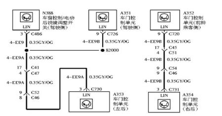 接车后,经试车故障确如用户所述。根据该车的故障症状结合笔者的维修经验,该车可能的故障原因为:控制单元硬件冲突、线路故障或控制单元本身故障。首先,考虑到天气骤然变化或驾驶员操作不当使控制单元工作不稳定,造成网络通信错误,无法自行恢复,控制单元停止工作。为此,笔者决定先进行蓄电池断电处理。经对蓄电池负极接线断电10 min后,将其装复,试车一切正常。连续试验闭锁、开锁及升降车窗功能均正常,但操作几次后,故障再次出现,电动车窗升降开关指示灯不亮。