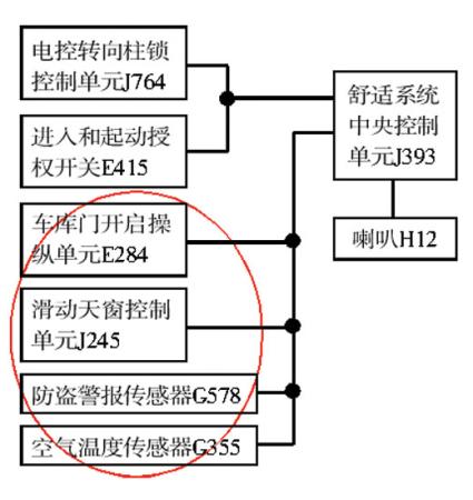 带着疑问,笔者查阅了该车的自学手册,但手册中并没有关于天窗和空气湿度传感器之间关系的介绍。于是,笔者对相关电路图及网络拓扑图进行了仔细分析,发现空气湿度传感器G355、天窗控制单元J245、防盗警报传感器G578以及车库门开启操纵单元E284处于同一条LIN总线网络中(图4)。据此,笔者分析认为,之所以空气湿度传感器损坏会导致天窗失灵,是因为LIN总线通信故障所致。