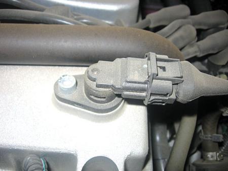 接车后,经确定,故障确如用户所述。维修人员首先连接故障诊断仪对发动机控制系统进行检测,设备显示发动机控制单元内存储了故障码“P0341——凸轮轴位置传感器信号不正确”。根据我们维修该车的经验,在该车的发动机控制系统的控制策略中,当出现凸轮轴位置传感器失效的故障时,发动机会出现起动困难和发动机最高转速超不过4 000 r/min的故障症状,同时发动机控制单元会存储故障码P0341。经对比发现,凸轮轴位置传感器(图1)失效后的故障症状与该车的故障症状完全吻合。