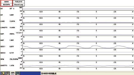 使用IDS读取数据流(附图),可以看到BARO的压力值(大气压力)低于正常的水平,正常应该是在101 kPa左右,而2次读取数据流却显示了不同的大气压力值。会不会是MAP传感器计量偏差造成进气计量出现错误呢?更换MAP传感器之后,试车问题依旧存在。因为之前已经排除了其他的故障可能,只剩下燃油质量是最大的疑点了。