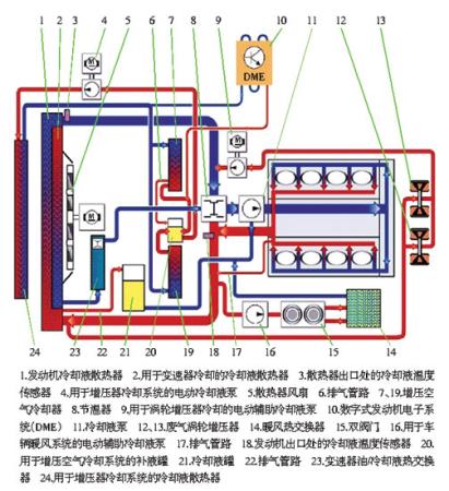(2)另一个冷却液循环系统用于增压空气冷却,冷却液在电动冷却液泵的作用下,从增压器冷却液散热器分三路分别到达发动机控制单元外壳以及左、右增压器冷却器,吸热后回到散热器。