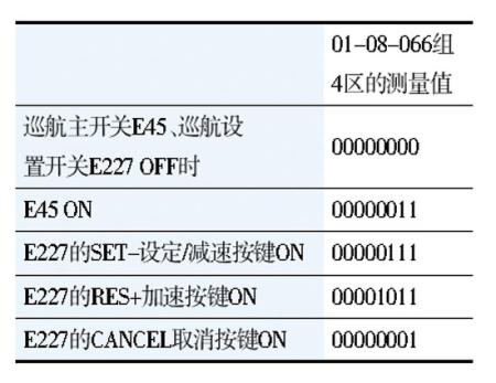 为验证J453是否能发送信号,开启巡航开关,仪表上巡航指示灯点亮,16-08-002组是转向盘左侧巡航控制按键的测量值,其含义1区是巡航系统加速开关信号,2区是巡航系统减速/SET设定开关信号,3区是巡航取消开关信号。分别按动这些按键,测量值均出现变化,说明多功能转向盘控制单元已识别到了这些信号。进入发动机控制单元J220查阅数据块01-08-066组4区的测量值(表2),当按动巡航系统各个开关时,对应的测量值均由0变成了1,说明J220可以接收到J453发出相应的调制信号,多功能转向盘控制单元J453出现故障的可能也可以排除。