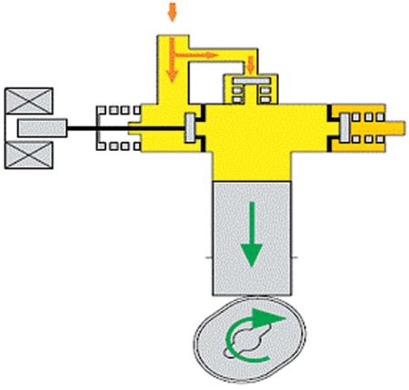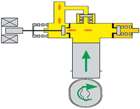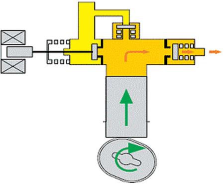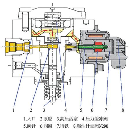 下面再来具体分析一下高压油泵的工作原理。首先,当活塞向下运动时,压力约为0.6 MPa的燃油从油箱内的低压油泵经进油阀流入油泵腔内(图2)。当活塞向上运动时,燃油就被压缩了,在压力超过油轨内压力时,燃油就被送入燃油分配管(图3)。燃油计量阀(可控阀)位于油泵腔和燃油入口之间(图4)。如果燃油计量阀在供油行程结束前打开了,那么油泵腔内的压力就会被卸掉,燃油就流回到燃油进入口内。在油泵腔和燃油分配管之间设有1个单向阀,它在燃油计量阀打开时可阻止燃油回流。为了调节供油量,燃油计量阀从油泵凸轮的下止点到某一行程之间是关闭的。当达到所需要的油轨内的压力时,燃油计量阀打开,这样就可防止油轨内压力继续升高。出于安全原因,燃油计量阀(MSV)N290是在不通电时打开的电磁阀(图5),即高压油泵所供应的全部燃油经打开的阀座被泵回到低压管路内。线圈通电后会产生电磁场,与衔铁连在一起的阀针就被压入到阀座内。当达到要求的油轨内压力后,燃油计量阀的供电被切断,电磁场消失,高压油将阀针从泵腔中压出,于是泵腔中多余的燃油就流回低压管路中。