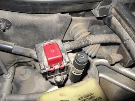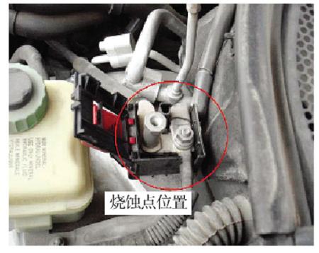 正当我们准备对发动机控制单元的供电和搭铁情况进行检查时,故障现象却消失了。发动机的各项数据均正常,高压压力也恢复了正常。面对如此尴尬的局面实属无奈,但通过前面的检查已经将故障查找范围缩小了很多,于是笔者重新整理思路,准备继续检查。在对发动机控制单元的供电和搭铁线路进行检查后,没有发现问题,因此笔者判定发动机控制单元存在问题。于是决定将同款车型无故障的发动机控制单元进行替换,并让用户继续观察使用。几天后,用户打来救援电话称该车蓄电池亏电无法起动。维修人员将车跨接起动后开回厂,此时发动机又出现了原来的故障现象。但笔者在检查过程中发现了1个新的故障现象,即发动机熄火后无法起动,类似于蓄电池没电的现象,但此时蓄电池电量充足。看来是车上的电源线出了问题?于是笔者决定从蓄电池的接线处开始逐步检查各连接点和线束的情况。当检查到位于发动机舱左侧的正极跨接桩头(图6)时,发现在桩头与线束的连接处有明显的松动烧蚀迹象(图7)。该位置正是蓄电池正极主线分向各分支的连接点,由于连接点的松动烧蚀,使得各分支线束间产生了接触不良的现象,正是这个故障点导致了发动机控制单元的供电不良,从而出现了燃油计量阀N290的控制信号错误的情况。