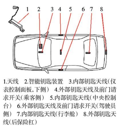 由于对方没有相关的维修经验,于是将车辆开到笔者所在的服务店进行检查。笔者使用日产专用故障诊断仪CONSULT-Ⅲ测试了相关系统,没有发现故障码存储,进行钥匙注册时出现无法注册的提示。日产NATS系统通过3个内部天线和3个外部天线(图1)来接收智能钥匙的信号,然后反馈给车身控制单元BCM,用来控制车门的开锁和闭锁、点火开关的起动以及钥匙注册功能。