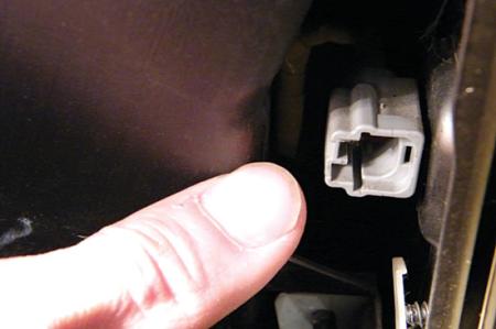 笔者分析,与注册有关的天线主要包括仪表板内部的天线2和中央控制台的天线1,主要功能是智能钥匙使用及注册信号接收反馈。由于2个天线在仪表板和中央控制台内,拆卸起来比较麻烦,为了确定自己的判断,笔者利用故障诊断仪对智能钥匙单元内的天线进行主动测试,将智能钥匙放在车内,关闭点火开关执行天线主动测试,发现只有天线1关闭后没有反应,只要一断开其他天线则应急灯便会闪烁,这样就可以基本确定故障部位了,于是决定对天线1进行检查。拆下中央控制台后面的饰板,找到室内天线1,发现天线上的线束插座上没有插头(图2)。