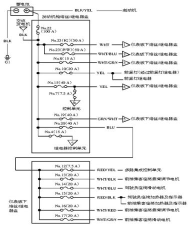 查阅电路图(图1)可知,22号熔丝分出2条支路,一条支路去往交流发电机,经测量,发电机输出电压正常,说明交流发电机发电正常,排除此支路故障;另一条支路又分出多条支路,分别通过4号、8号、10号、15号、19号、20号和23号熔丝供电,于是笔者依次拔下这些熔丝,当拔下20号熔丝时,试灯立即熄灭,由此确定了漏电点在20号熔丝之后的线路中。