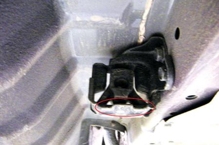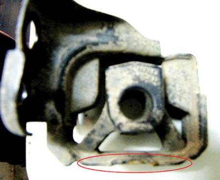 虽然找到了故障原因,但是很多维修并不能彻底解决问题。笔者检查多辆故障车后发现,消声器支架垫下方有明显的干涉痕迹(图2)。根据异响产生的原因,笔者认为只要解决支架垫的干涉问题,就可以排除异响,