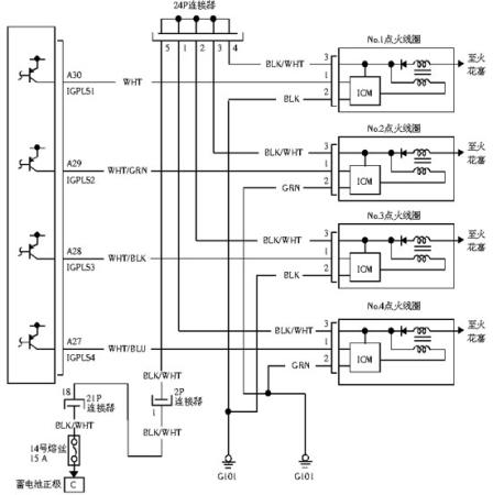 笔者分析认为,各缸均无点火高压,4个点火线圈同时出现故障的可能性极小,但为了以防万一,笔者还是对各缸点火线圈的线路进行了检查。根据电路图(图1),首先断开1缸点火线圈的3P插头,打开点火开关,经万用表测量发现:3号脚BLK/WHT(黑/白)线为蓄电池电压;2号脚BLK(黑)线与接地之间的电阻小于1 Ω;1号WHT(白)线,即来自发动机控制单元的信号线,测量其电压为2.3 V左右。以上测量结果均正常。然后笔者又依次测量其他3个缸的点火线圈3P插头,测量结果同1缸基本相同。笔者断开发动机控制单元的A插头,分别测量各缸点火线圈插头与发动机控制单元之间1号信号线的电阻,结果均正常。