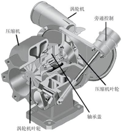 奇瑞G5轿车搭载的2.0T发动机采用的是废气涡轮增压器,该涡轮增压器主要由涡轮机叶轮、压缩机壳、轴承盖、压缩机叶轮、涡轮机盖及旁通控制阀等元件组成,其结构图如(图1)所示。
