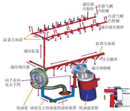 发动机润滑系统的油路如(图2)所示。来自发动机润滑系统的供油在油压的作用下,将大量的机油输送至中间壳,在中间壳再分配给轴承。这些大量的润滑油形成一个区域,轴承在里面可以自由转动,润滑油又通过涡轮增压器轴承被送回油底壳。