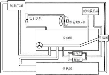当发动机起动时,涡轮增压器中间轴承壳通过热虹吸效应由发动机冷却系统进行冷却。在发动机停止运转约5 min后,若不能对涡轮增压器进行冷却,它将达到最高温度,这时会因缺少油流而引起涡轮增压器的“热浸式”状态,从而导致涡轮增压器提前损坏。为避免这种情况的发生,在涡轮增压系统中设置了冷却管路(图3、图4),以便在发动机停机后对涡轮增压器继续进行冷却。当发动机停止运转后,电子水泵将冷却液泵入涡轮增压器冷却水道中,对涡轮增压器中间轴承壳的关键区域进行冷却,从而减少了“热浸”的影响,防止涡轮增压器提前损坏。