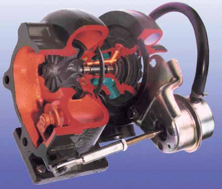 旁通阀利用一连杆来控制涡轮排气中的阀门,一旦涡轮压缩气端的增压值达到限定程度,进气压力便会推动旁通阀的连杆,使涡轮排气侧内的旁通阀门开启,部分废气不经涡轮叶轮直接排到排气管。这样减少“吹动”涡轮叶轮的废气流量,涡轮叶轮转速降低,同时带动压缩机叶轮转速降低,使涡轮增压压力维持一个稳定值。
