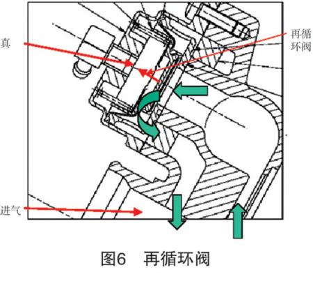 当发动机处于怠速工况或停机时,节气门接近全闭或完全关闭,这样在增压器的进气管路中会产生持续升高的压力(此时气体几乎不能流动),涡轮将受到很大的制动力。当节气门开启后,又希望增压器能尽快升至工作转速。为防止过度增压,设计人员采用了再循环阀(图6、图7)技术。再循环阀为气动元件,通过气压操纵膜片弹簧来实现开启。当真空度较大时,膜片弹簧被吸气,阀门打开;反之,则再循环阀关闭。只要节气门关闭,再循环阀就在增压管路中形成小循环,这样可避免涡轮被制动;节气门重新开启时,进气岐管真空度下降,再循环阀在膜片弹簧作用下回位,处于关闭状态,小循环回路断开,进入压力调节状态。