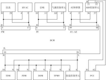 G5轿车的车身电器控制系统主要由车身控制单元BCM、后车身控制单元TDM、驾驶侧车门控制单元DDM、右前门控制单元PDM、左后门控制单元LRDM及右后门控制单元RRDM组成。BCM车身控制单元为主控制单元,其余控制单元为辅助控制单元。G5轿车采用了CAN总线系统,其总线系统网络拓扑图如(图8)所示。