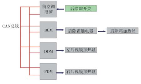 如果下列条件中的任意一个被满足,系统将停止后除霜功能:①当打开后除霜功能后,又按下后除霜按钮;②20 min的计时时间到;③当点火开关置于OFF位置。