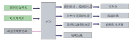 当组合开关置于洗涤档时,BCM命令前洗涤电机进行前风挡玻璃洗涤。