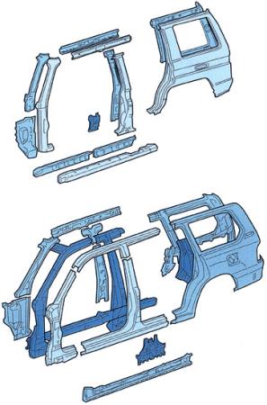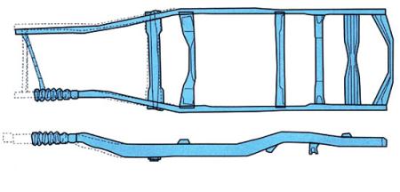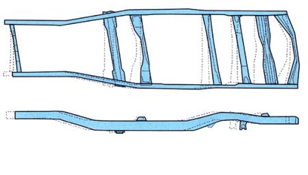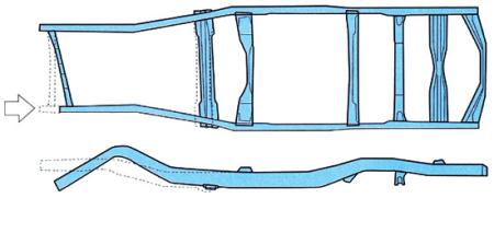 如果大梁式车身的车辆前部或后部受到撞击,则大多数撞击力都会在大梁变形过程中被吸收掉。大梁式车身变形的一个特点,就是即便撞击来自车身前部,但是整个大梁都有可能发生变形,造成这种现象的原因是大梁与车身相互独立。此外,撞击对大梁前部造成的损伤可以一直传递到后部,这是因为大梁纵梁是由整块材料构成的。