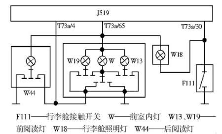 在熔丝SC18正常的条件下J519的T73a/65端子有12 V电压(图12)加在室内灯W、前阅读灯W13、W19和后室内灯W44上。车门关闭时4个车门开关均断开,与室内灯W等的另一端连接的T73a/4端子也处于高电位,室内灯因两端电位相同,处于熄灭状态。当驾驶员侧车门打开时F2闭合,接地信号输入J519的T73a/19端子,J519识别到车门打开后令其T73a/4端子处于低电位,W、W13、W19和W44两端电位差形成电流回路点亮室内灯。路径为T73a/65→室内灯W、前阅读灯W13、W19和后室内灯W44(室内灯开关处于门控位置)→T73a/4端子,该信息通过数据总线传输到仪表,点亮车门开启指示灯提示驾驶员。室内灯工作状态根据车门位置和点火开关的信号存在3种模式:一是关闭车门,延时约30 s后,J519的T73a/4端子由低电位翻转为高电位,室内灯熄灭;二是关闭车门后点火开关ON或车门闭锁,室内灯立刻熄灭;三是车门未关,室内灯延时约10 min后关闭,以防止电力过分耗损。DTM功能可对室内灯进行终端测试。