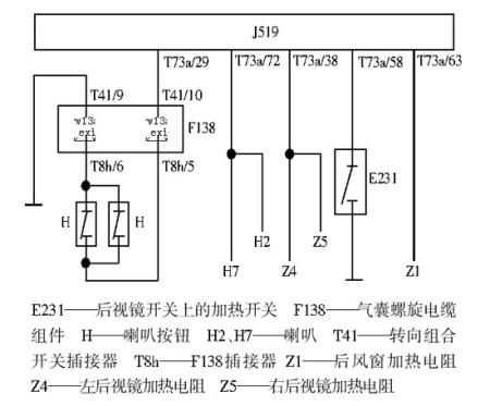 当后视镜开关上的旋钮处于加热位置时,后视镜加热开关E231与地接通(图13),低电位信号输入J519的T73b/58端子,T73a/38端子输出12 V电压加在左侧后视镜加热电阻Z4和右侧后视镜加热电阻Z5上。