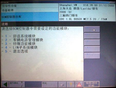 与其他大众车型一样,朗逸可通过VAS505X自诊断功能和引导性功能下的匹配选项来进行BCM的个性化设置。